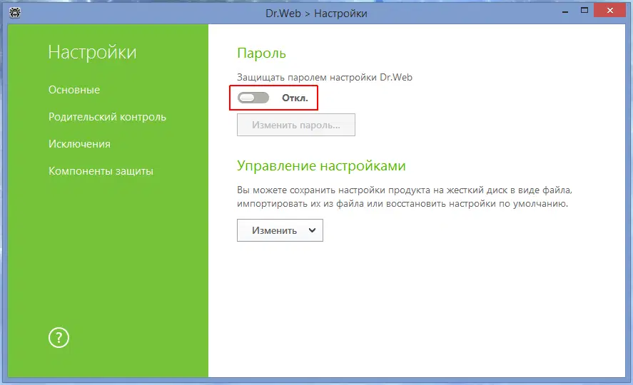 В онке настроек, включите переключатель "Защищать паролем настройки Dr.Web":