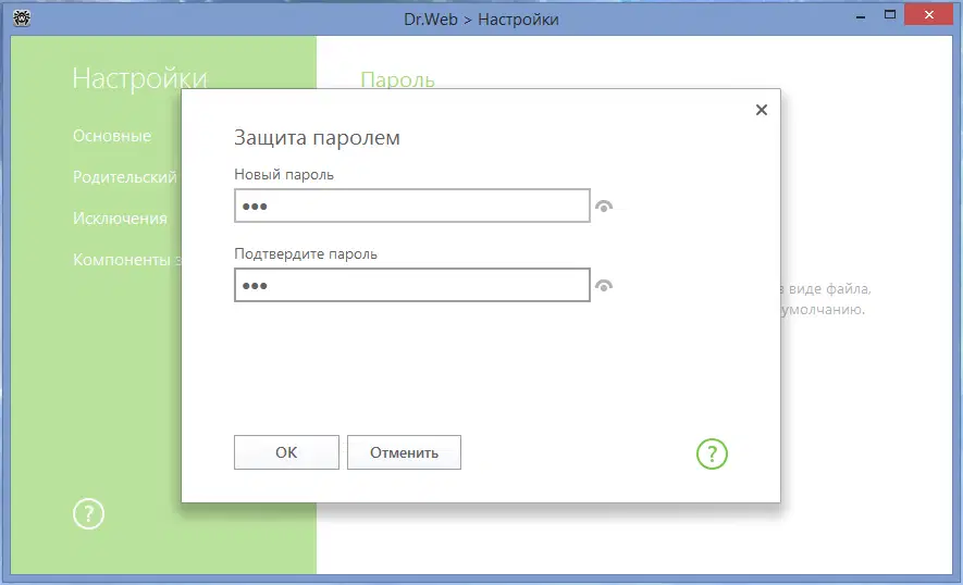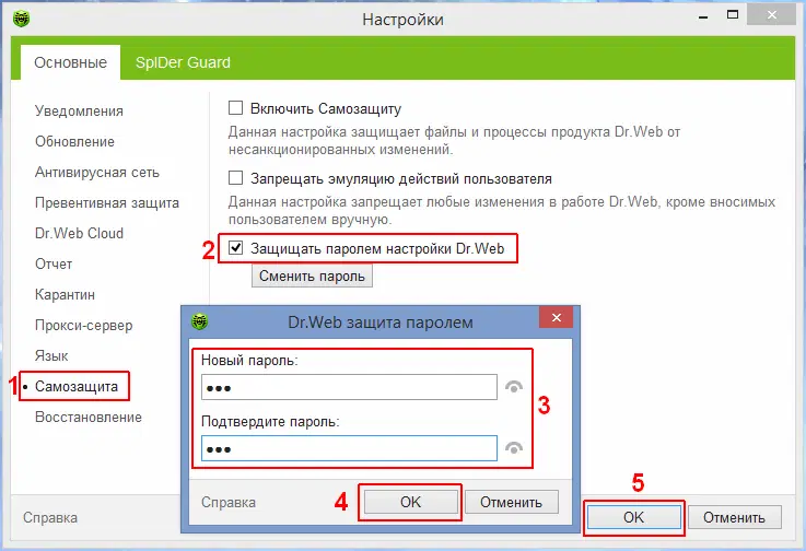 На вкладке "Самозащита", отметьте пункт "Защищать паролем настройки Dr.Web", введите новый пароль два раза и нажмите "OK":