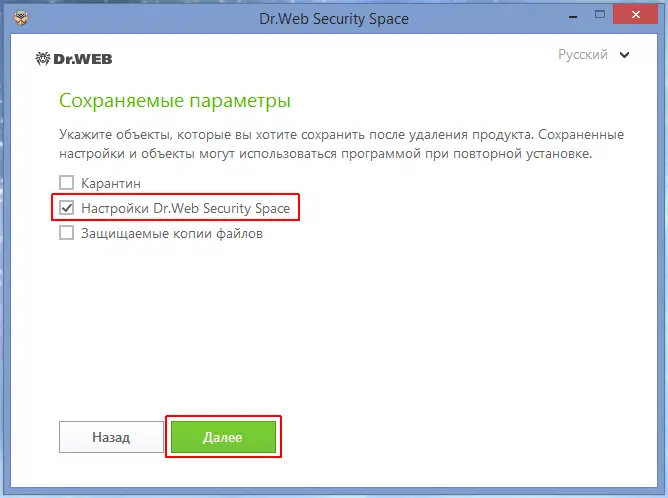 Для этого, нажмите кнопку "Пуск", откройте "Панель управления" и выберите "Удаление программ" или "Программы и компоненты". В списке установленных программ, выберите "Dr.Web" и нажмите "Удалить". В окне удаления снимите отметку с пункта "Настройки Dr.Web" и нажмите "Далее":
