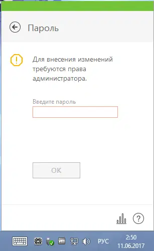 Если антивирус защищён паролем, то при попытке изменить настройки или отключить защиту, появится окно с текстом "Введите пароль" или "Для внесения изменений требуются права администратора":