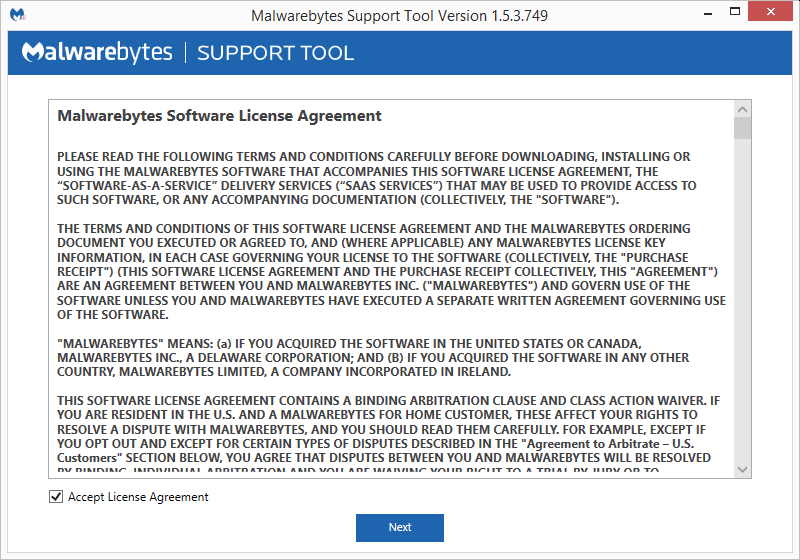 Если программ Malwarebytes нет в списке установленных программ, удаление не выполняется или завершается ошибкой, то для очистки системы от программного обеспечения Malwarebytes, необходимо воспользоваться утилитой Malwarebytes Support Tool.