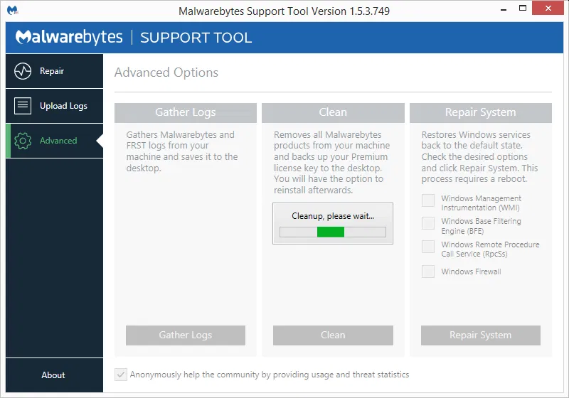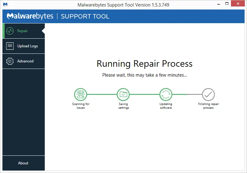 Утилита Malwarebytes Support Tool позволяет устранить проблемы в работе программ Malwarebytes. Утилита может восстановить работоспособность продуктов Malwarebytes или полностью удалить их из системы.