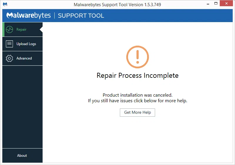 Если утилита не устранила имевшиеся проблемы в работе программы, то появится сообщение "Repair Process Incomplete". Также, это сообщение появится, если вы отменили обновление или установку Malwarebytes в процессе работы утилиты.