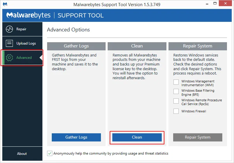 Если восстановление не устранило проблемы в работе программ Malwarebytes, то необходимо выполнить полное удаление всех установленных продуктов Malwarebytes из системы. Запустите утилиту Malwarebytes Support Tool и переключитесь на вкладку "Advanced". Нажмите кнопку "Clean" для запуска процесса удаления Malwarebytes с компьютера.