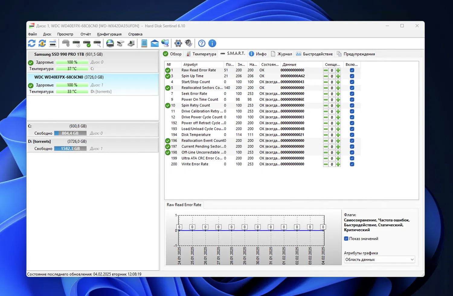 - Расширенная информация о дисках и SSD, включая информацию об ошибках, самотестировании, статистику и дополнительные функции.