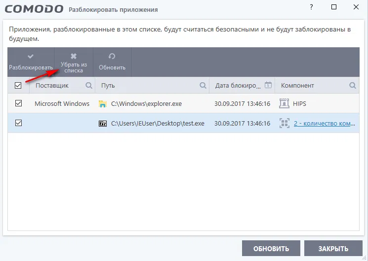 Сама же кнопка «Разблокировать» раздвоилась на варианты «для всех защитных компонентов» и «для сработавших».