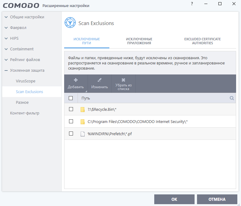 Впрочем, возможность эта слегка не доработана: «исключенные пути» можно добавлять только в окне настройки, а не через оповещения облачного сканера. Также в настройке COMODO Firewall красуется чисто антивирусная вкладка Исключенные приложения — она, по-моему, для фаервола не играет никакой роли.