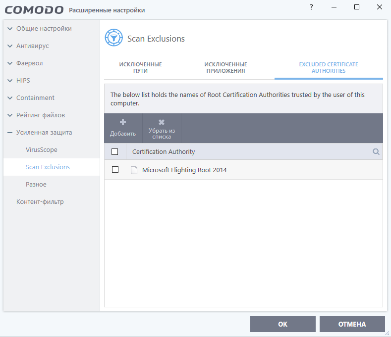 Список корневых сертификатов, добавленных пользователем в доверенные, помещен в одну секцию с антивирусными исключениями. А сама эта секция переехала из раздела настройки антивируса в «Усиленную защиту». Хотя такая компоновка и сбивает с толку, есть в ней одно достоинство: список антивирусных исключений стал доступен в COMODO Firewall. Дело в том, что даже «чистый фаервол» препятствует работе программ, которые он считает «вредоносными» (этот рейтинг присваивается при включенной облачной проверке). Теперь стало возможным исключить определенные пути в случае ложного детекта.