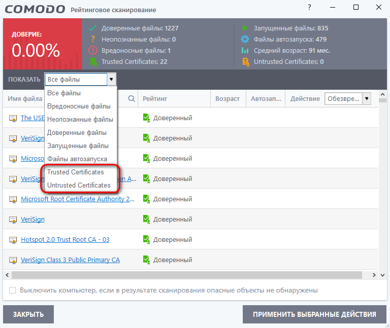 Что странно, при «Полном сканировании» корневые сертификаты не проверяются.