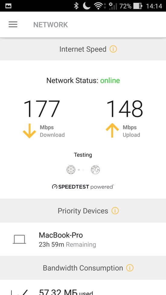 В разделе Devices вы можете приостановить доступ к Интернету для всех или некоторых устройств, а также просматривать, какие устройства в настоящее время подключены и какие были подключены ранее. Наконец, в меню Network вы можете просматривать значения скорости интернета и потребления полосы пропускания, а также выбирать приоритетные устройства.