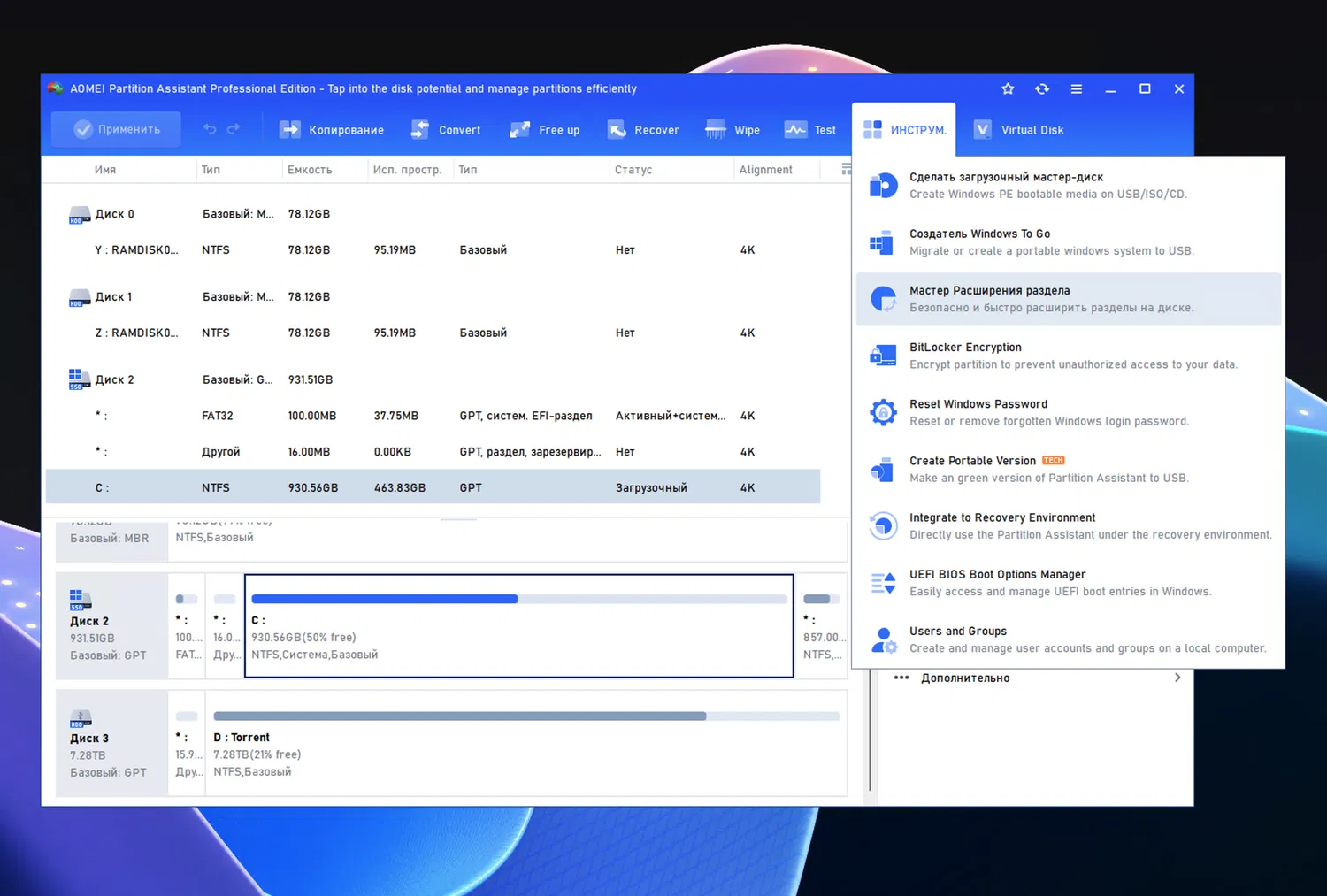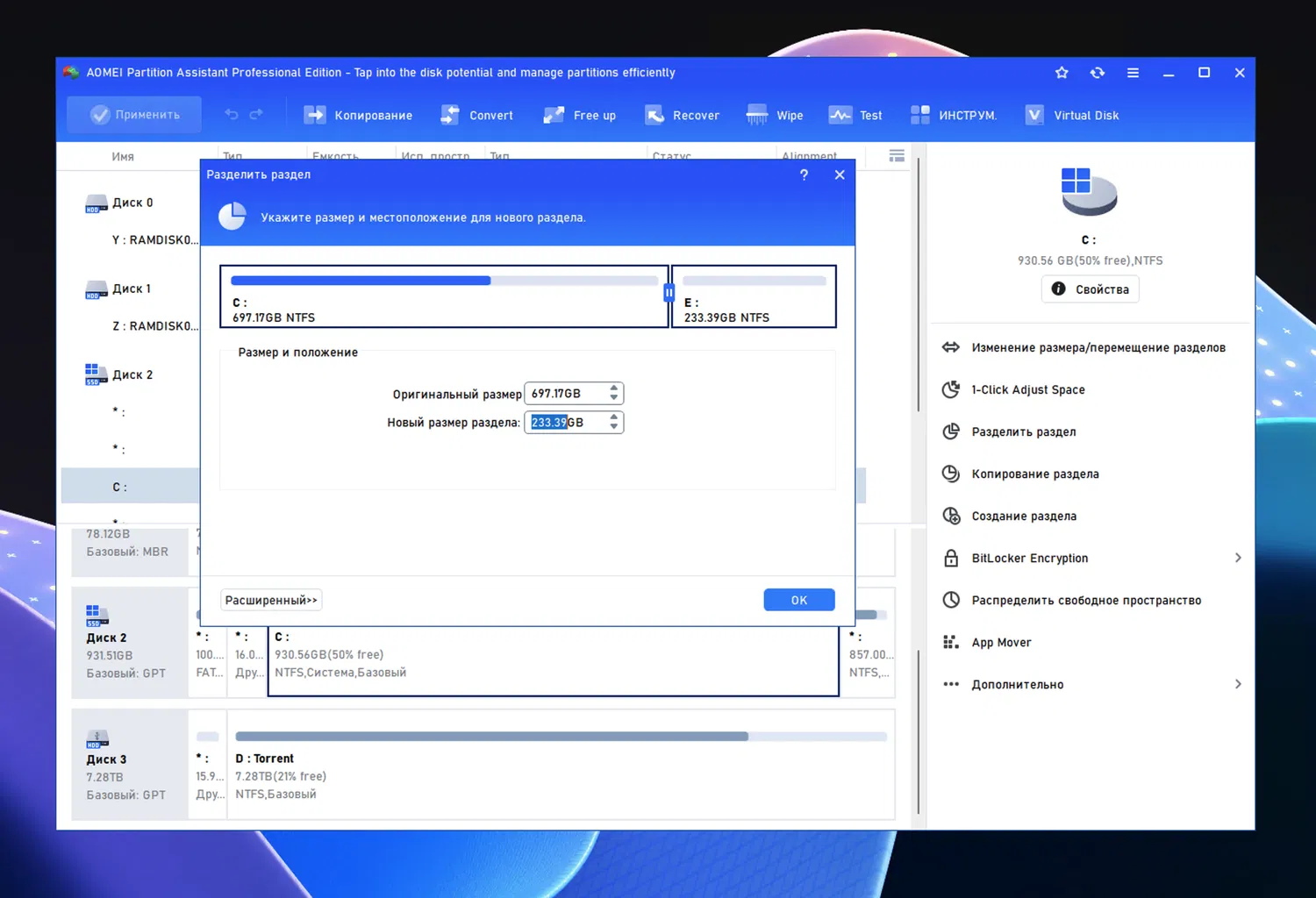 Вы также можете воспользоваться бесплатной версией AOMEI Partition Assistant Standard.