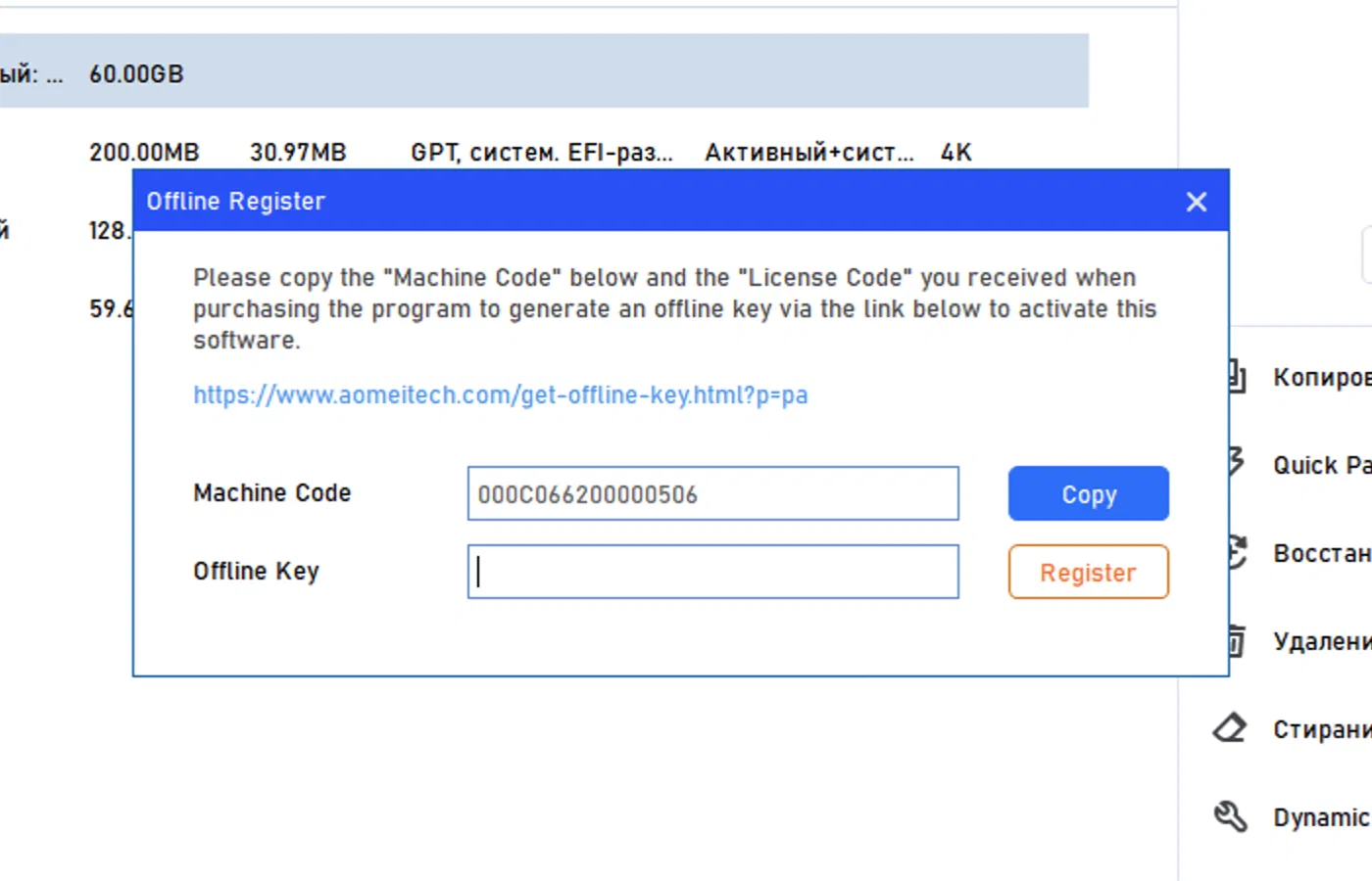 Для регистрации без интернета перейдите на страницу получения оффлайн ключа (автономного ключа), и используйте предоставленный License Code и Machine Code (доступен в меню регистрации после попытки активации без интернета).