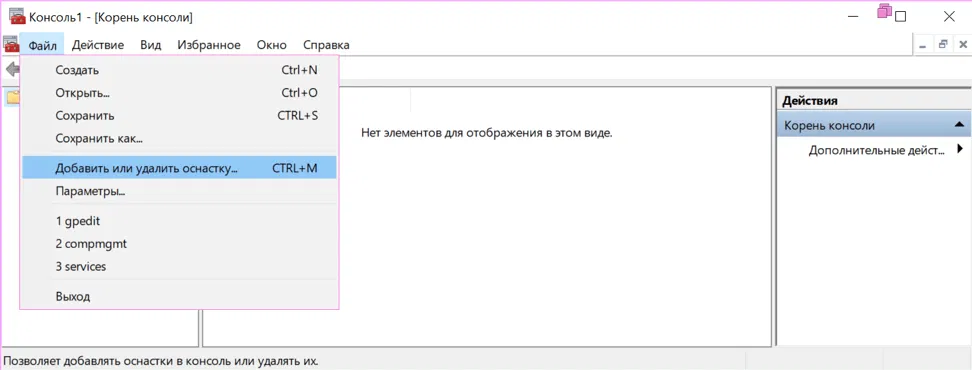 - Открыть меню Файл и выбрать опцию Добавить или удалить оснастку