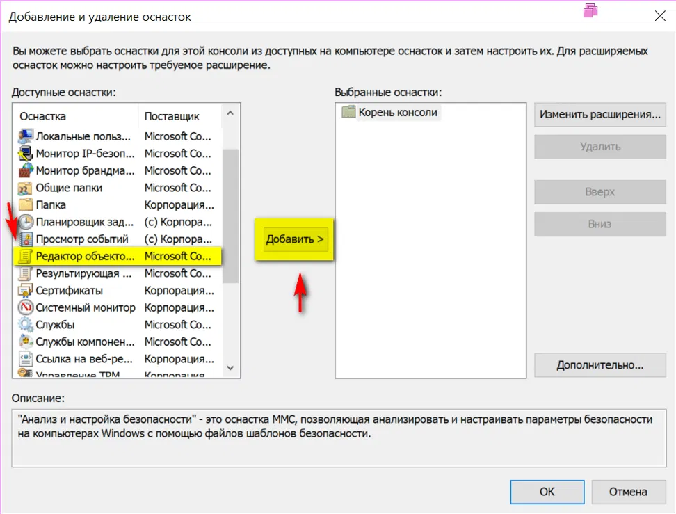 - Найти и выделить Редактор объектов групповой политики и нажать кнопку Добавить