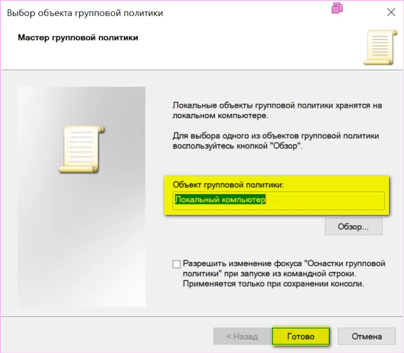 - В открывшемся мастере групповой политики в поле Объект групповой политики оставить по умолчанию Локальный компьютер (первый уровень, стандартная локальная политика) и нажать кнопку Готово.