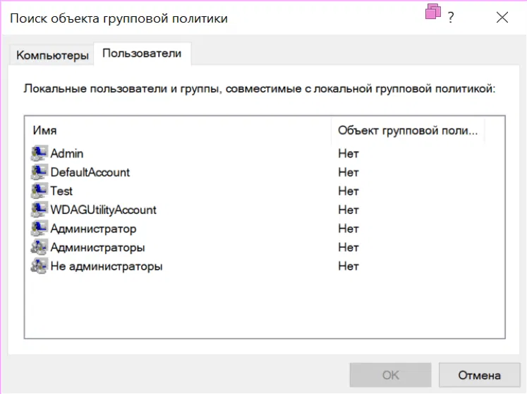 - групповая политика для администраторов и не администраторов. Эта групповая политика содержит только конфигурационные параметры пользователя и применяется в зависимости от того, является ли используемая учетная запись пользователя членом локальной группы Администраторы или нет;