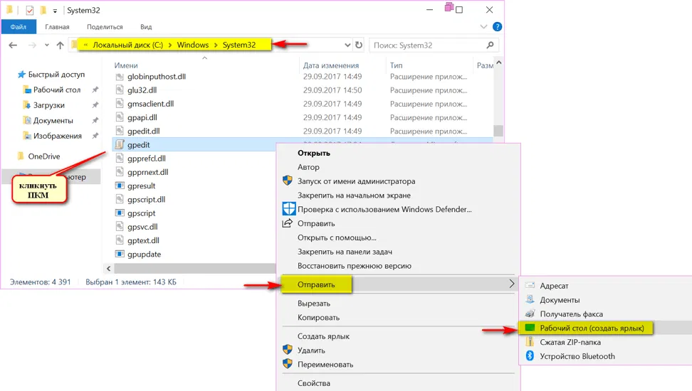 Для удобства можно добавить ярлык оснастки на рабочий стол. Для этого необходимо открыть C:\Windows\System32, выбрать правой клавишей мыши gpedit и отправить ярлык на рабочий стол.
