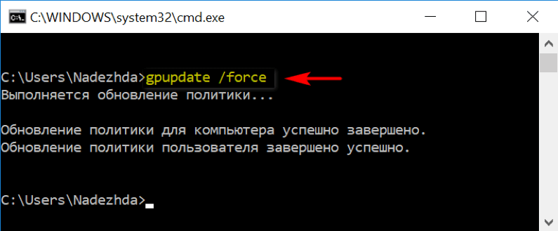 - использовать утилиту gpupdate.exe для принудительного обновления групповой политики. Для этого необходимо либо в окне Выполнить, либо в командной строке ввести