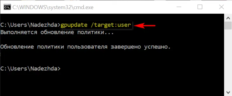 Например, для выполнения обновления политик для пользователя, необходимо ввести gpupdate /target:user.