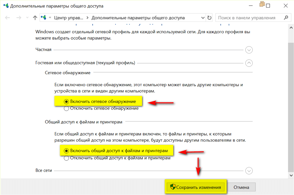 - Включить сетевое обнаружение для используемого вида сети