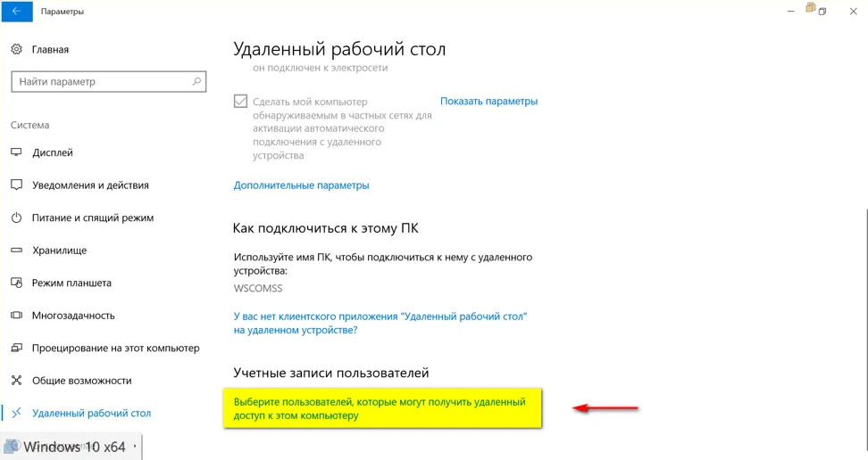 - Выбрать Пользователи удаленного стола