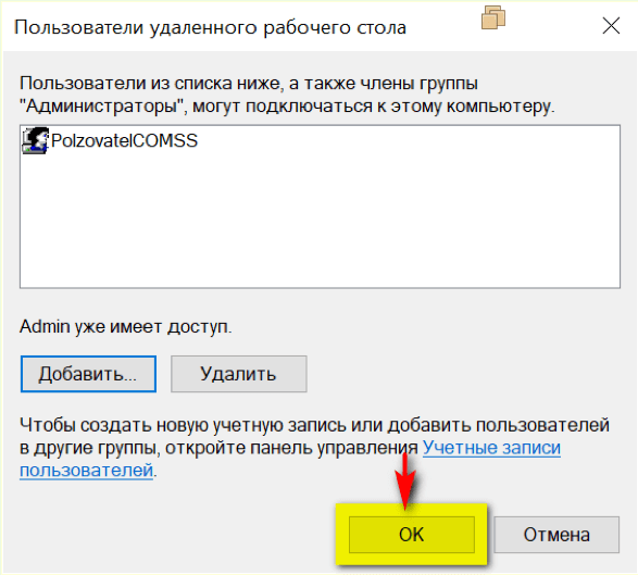 В целях безопасности подключаться к рабочему столу удаленного компьютера по умолчанию Windows разрешено следующим учетным записям: