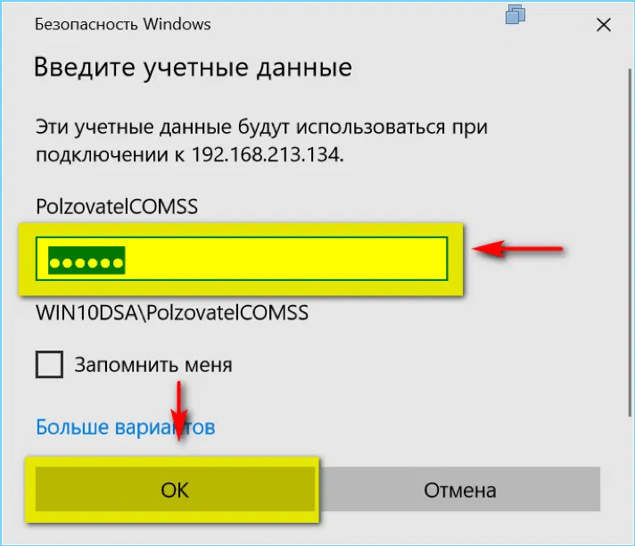 - Ввести логин и пароль учетной записи, которая зарегистрирована на удаленной рабочей станции (должна входить в группу Администраторы или в группу Пользователи удаленного рабочего стола) и нажать ОК