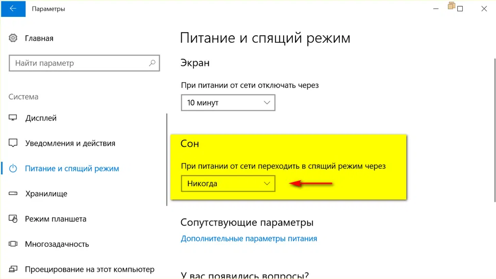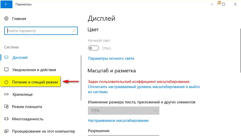 - Выбрать раздел Питание и спящий режим