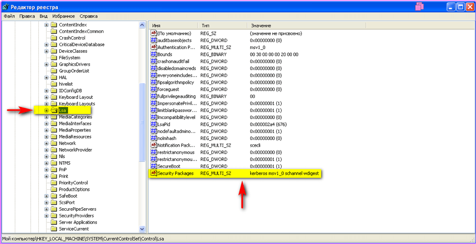 HKEY_LOCAL_MACHINE\SYSTEM\CurrentControlSet\Control\Lsa - открыть параметр Security Packages