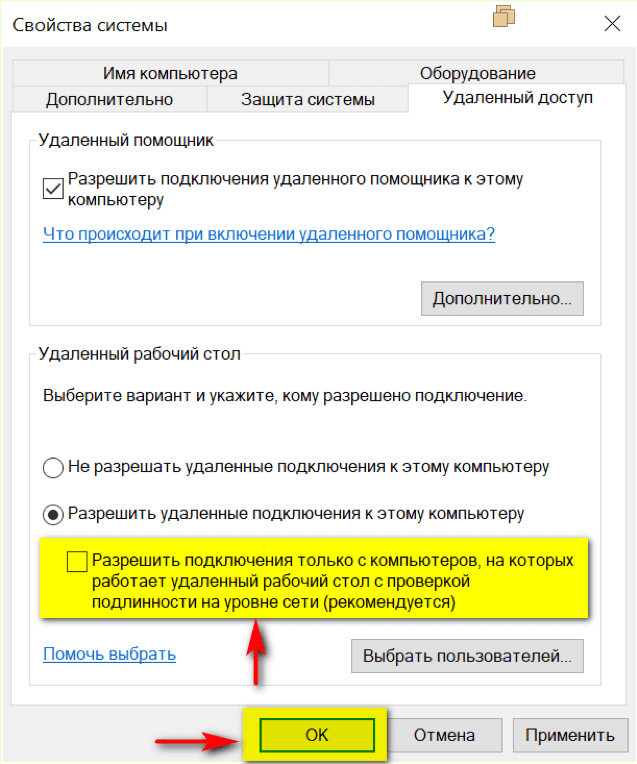 - Снять флажок в чекбоксе Разрешить подключения только с компьютеров, на которых работает удаленный рабочий стол с проверкой подлинности на уровне сети (рекомендуется)