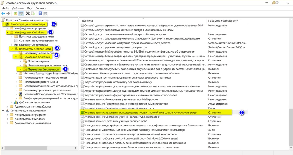 - Открыть параметр Учетные записи: разрешить использование пустых паролей только при консольном входе