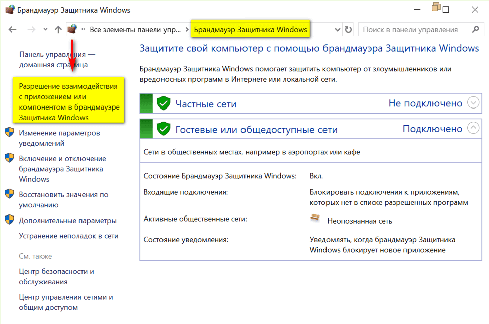 2. Выбрать ссылку Разрешение взаимодействия с приложением или компонентом в брандмауэре Защитника Windows