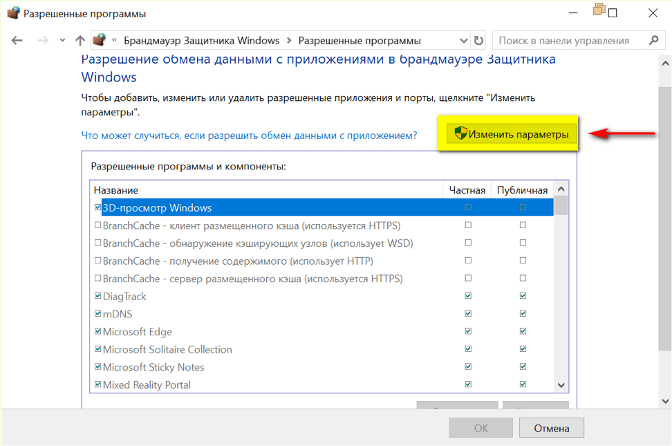 3. В открывшемся окне Разрешенные программы нажать кнопку Изменить параметры.