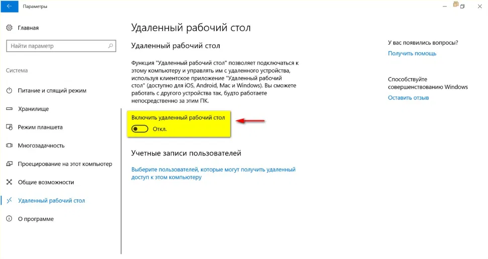 - Включить удаленный рабочий стол