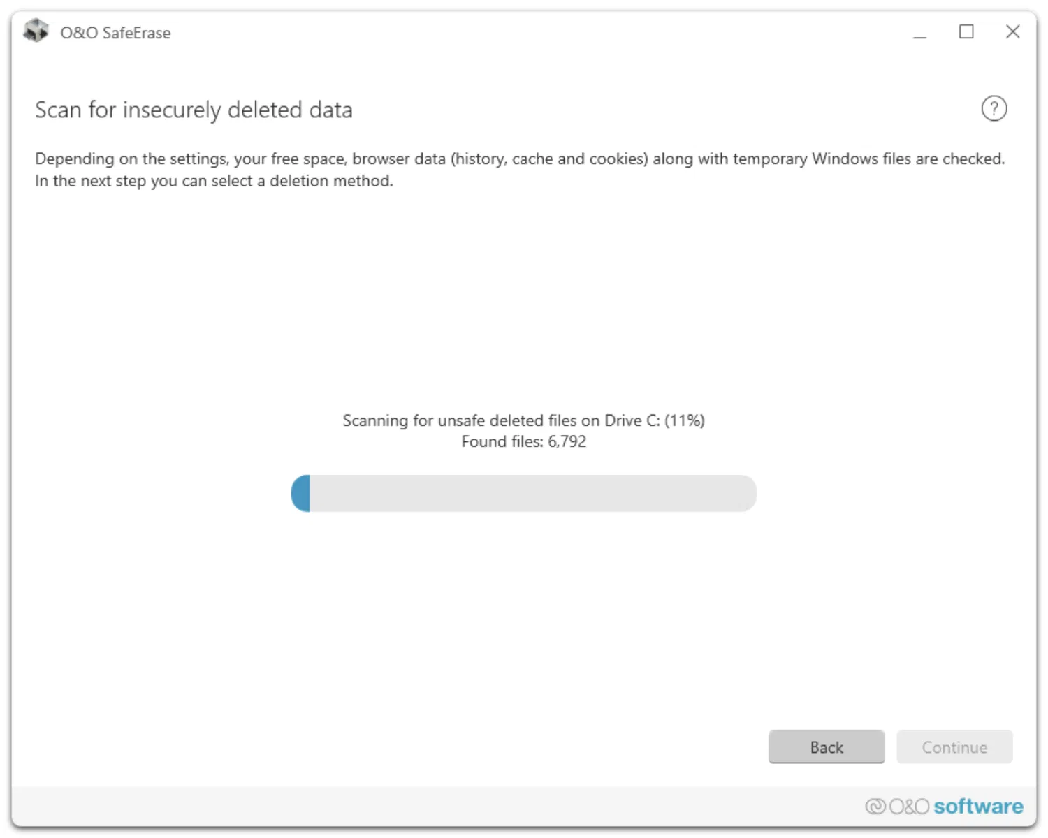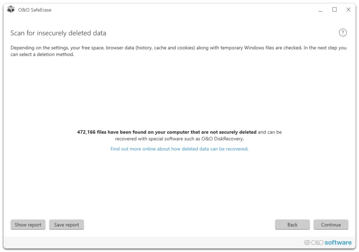 После завершения сканирования вы можете просмотреть список найденных объектов, нажав «Show report» (Показать отчёт), либо нажать «Continue» (Продолжить), чтобы выбрать метод безопасного удаления. При выборе «Back» (Вернуться) вы вернётесь на стартовую страницу, при этом никакие данные не будут изменены.