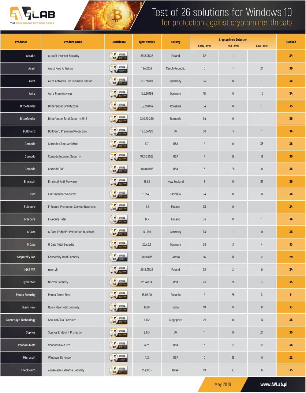 Менее половины протестированных программ безопасности остановили все образцы криптомайнера. Самый слабый результат был показан Защитником Windows. Программное обеспечение Microsoft не имеет такой большой базы данных угроз, как конкурентные продукты. Даже половина протестированных решений не может в каждом случае корректно обработать информацию о приложении-майнере (например, xmrig), загрузке одного и тот же файла с помощью вируса-загрузчика и запуске вредоносного ПО внутри PowerShell.