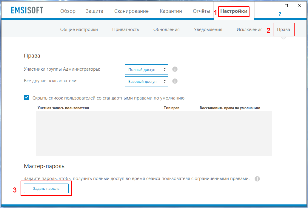 Некоторые функции в Emsisoft Anti-Malware могут быть защищены паролем. Защита паролем ограничивает доступ к антивирусу группе пользователей или отдельным пользователям. Доступно четыре уровня доступа: