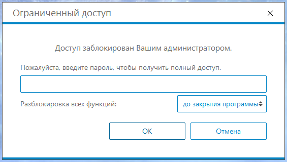 Если активирована защита антивируса паролем, при попытке отключить антивирусную защиту, появится запрос на ввод пароля: "Ограниченный доступ. Доступ заблокирован Вашим администратором.".