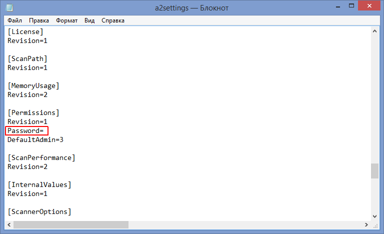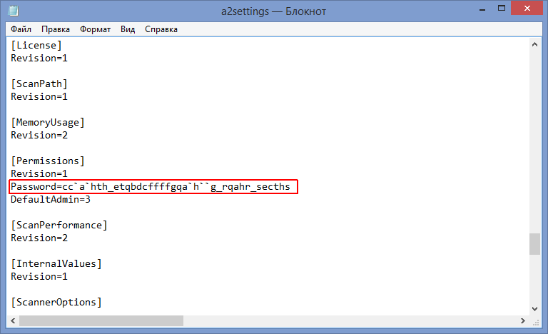 Файл a2settings.ini откройте любым текстовым редактором. Промотайте вниз документа и найдите строку Password=xxxx, где xxxx это различные буквы и символы: