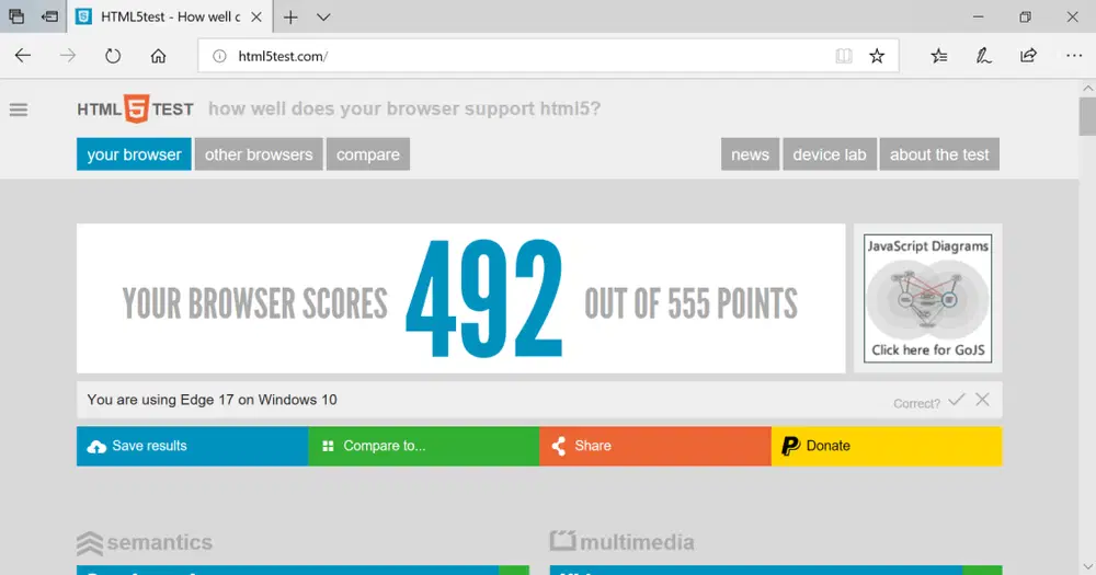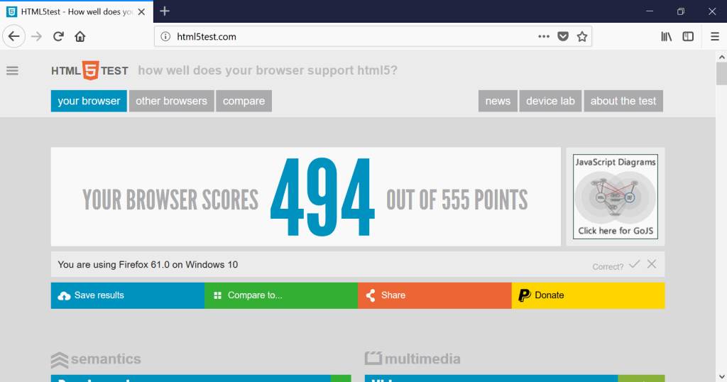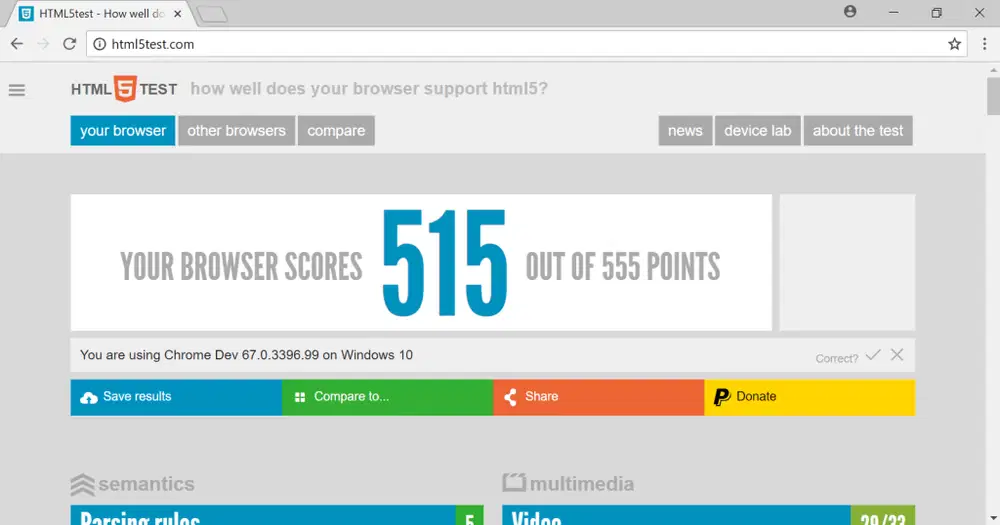 HTML5Test - тестирование возможностей HTML5 (результат: больше - лучше)