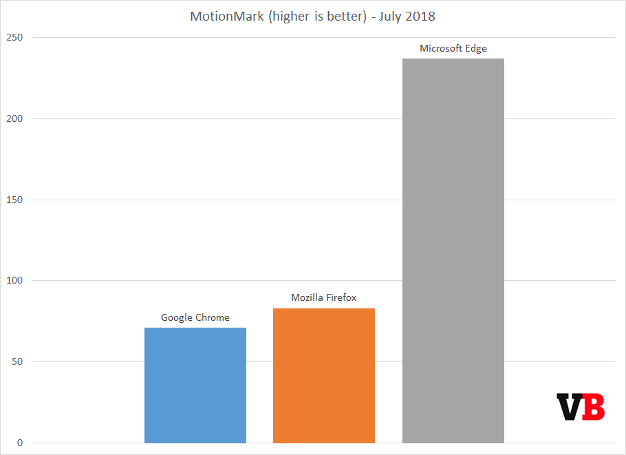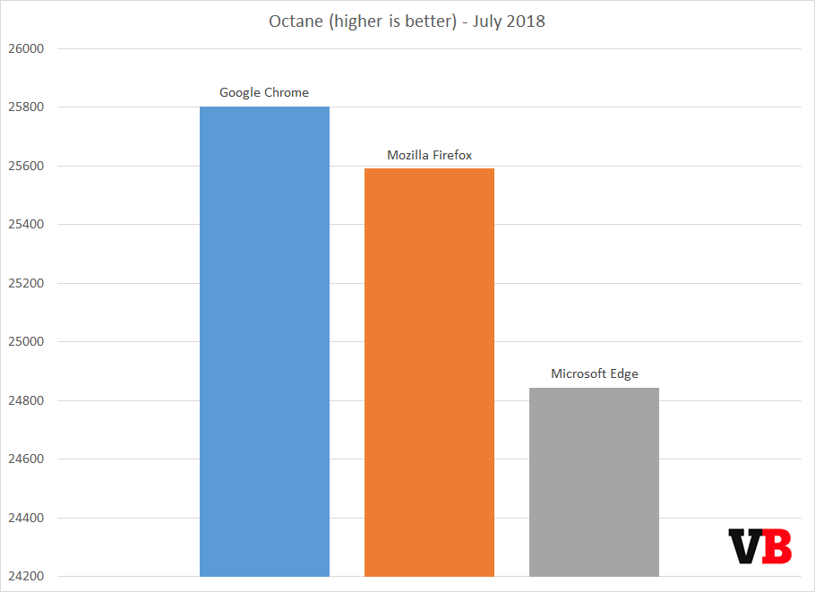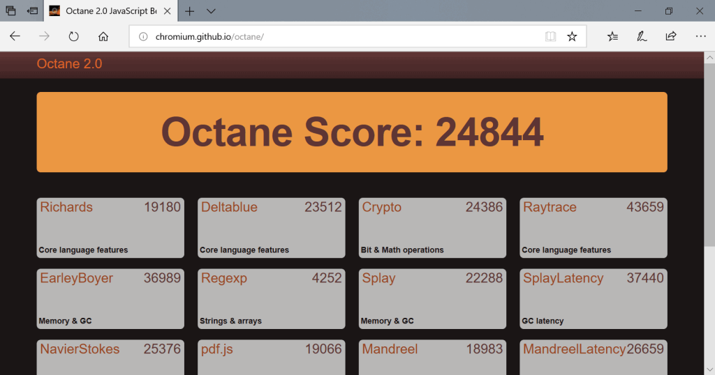 Учитывая, что Octane был разработан Google, неудивительно, что Chrome выиграл этот тест. Однако, в прошлом Edge показывал лучшие результаты. Не в этот раз.