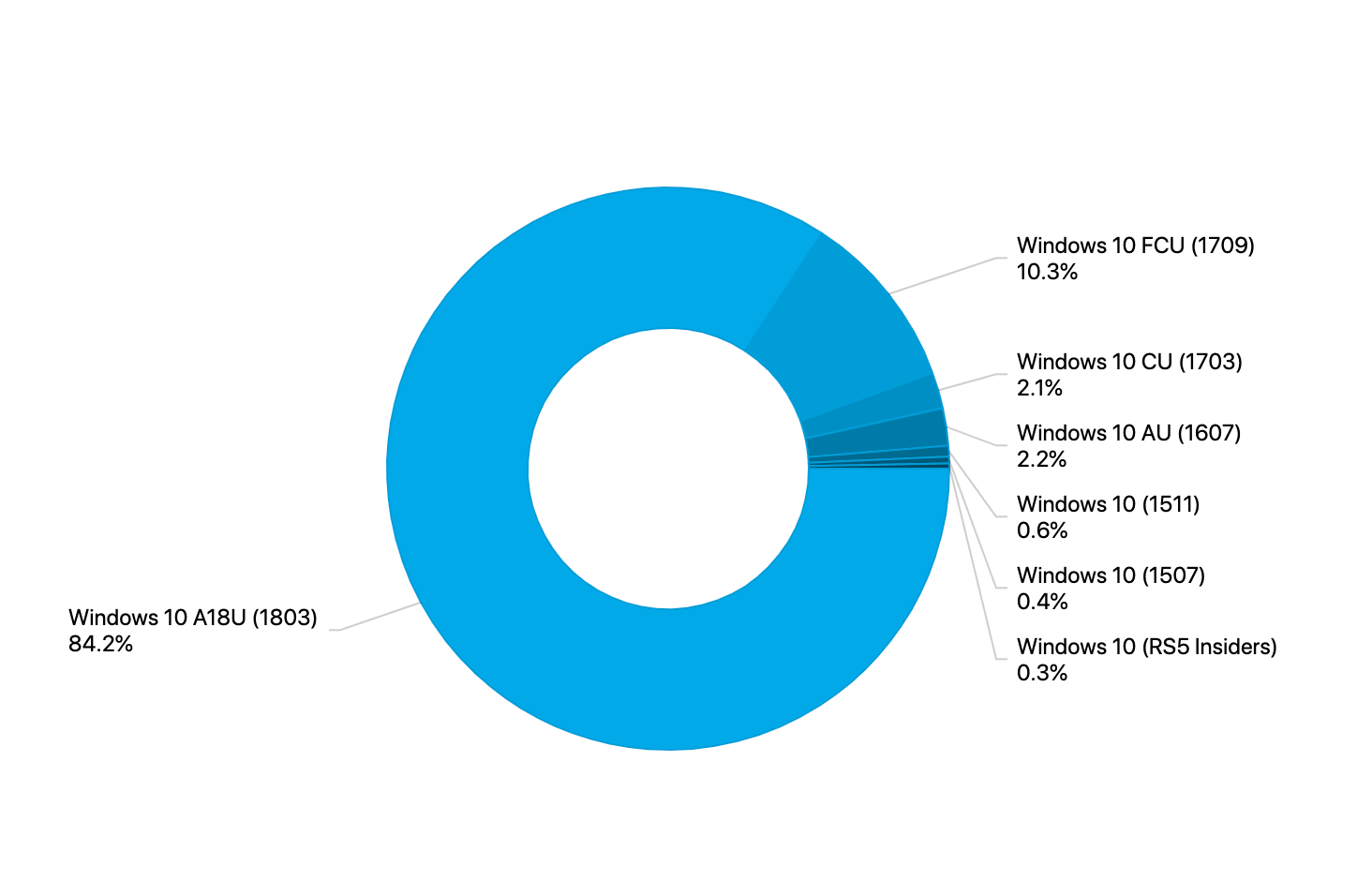 Ближайший преследователь - Windows 10 Fall Creators Update (версия 1709) установлен на 10,3% устройств Windows 10. Доли Creators Update (1703) и Windows 10 Юбилейное обновление (1607) составляют 2.1% и 2.2% соответственно.