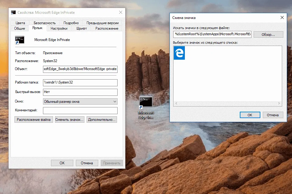 Совет: как вы можете заметить, по умолчанию ярлык использует иконку командной строки. Это связано с тем, что команда использует cmd.exe для запуска Microsoft Edge в режиме InPrivate.