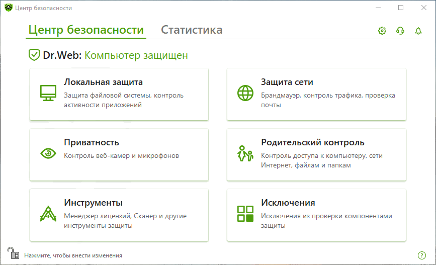 - Значительно усовершенствован графический интерфейс. Мы решились на эксперимент и сделали всё по-другому. Теперь у Dr.Web Security Space есть Центр защиты, в котором сосредоточились все основные компоненты, настройки и статистика работы антивируса.