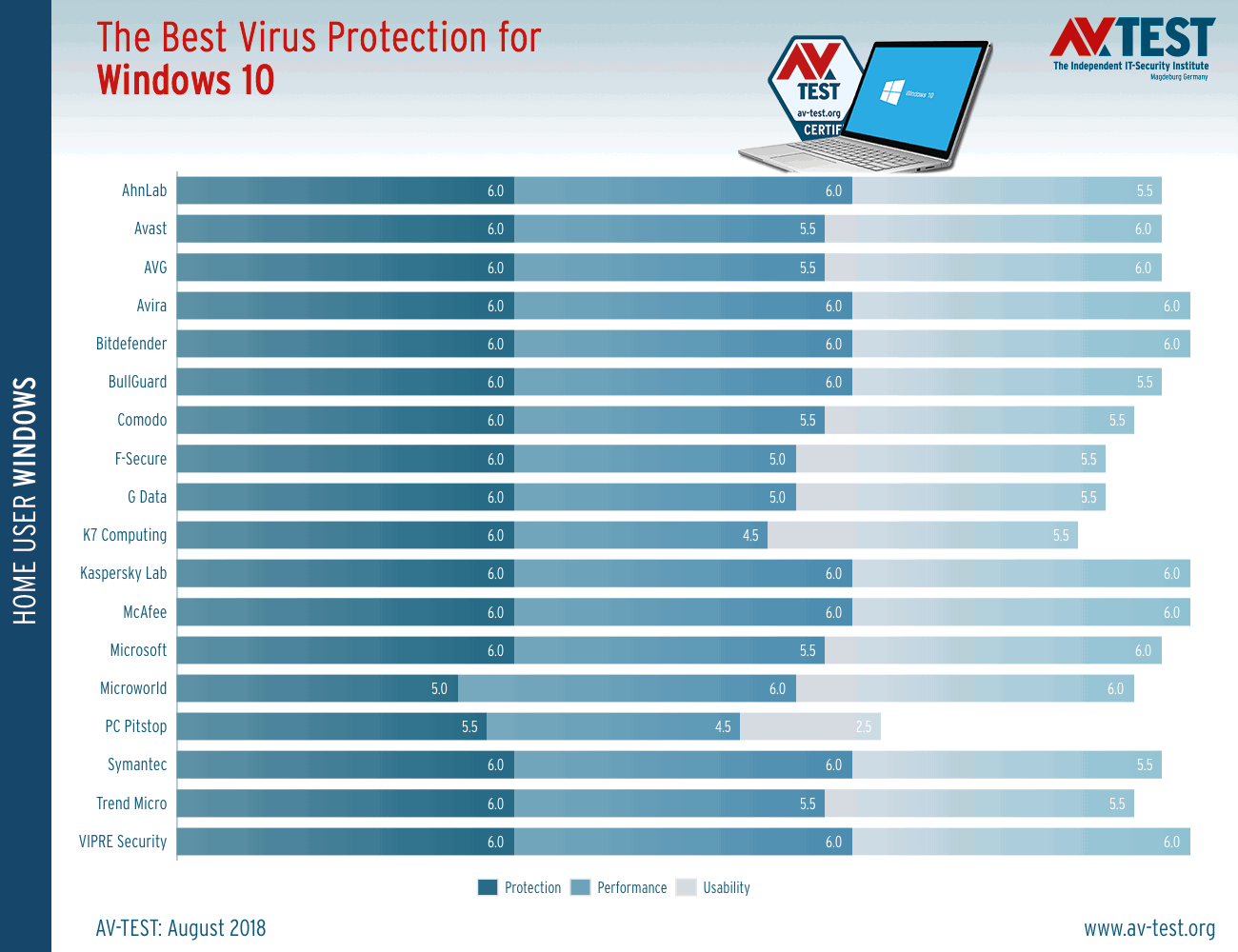 Предустановленный в Windows 10 антивирусный продукт набрал максимальные баллы в категориях защиты и удобства использования и потерял пол балла за производительность. В любом случае, он вплотную приблизился к лидерам.