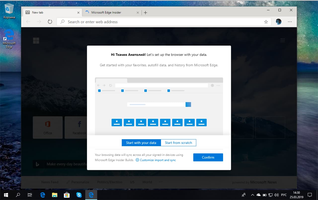 Тестовая сборка браузера Microsoft Edge построена на кодовой базе Chromium 75. При запуске Edge выводит запрос импорта данных: избранного, данных автозаполнения и истории из браузера Google Chrome.