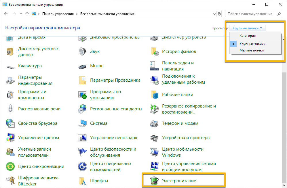 - Выберите раздел «Электропитание». Для быстрого перехода вы можете включить в меню "Панель управления" режим Просмотра: Крупные значки (Мелкие значки).