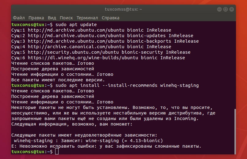 Следующие пакеты имеют неудовлетворённые зависимости: winehq-staging : Зависит: winehq-staging ( = 4.13 - bionic).