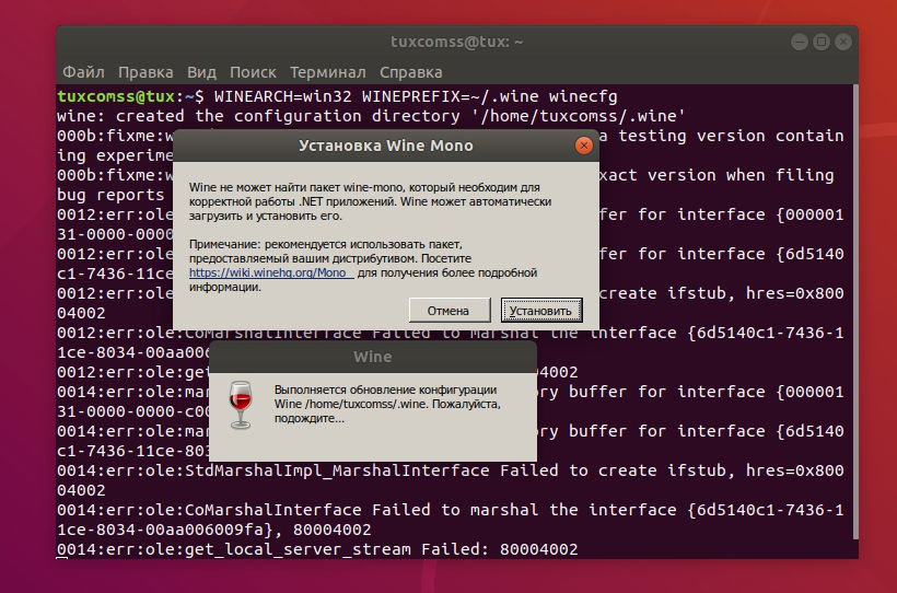 После выполнения команды создания префикса появится окно с предложением установить Mono и затем пакет Gecko.