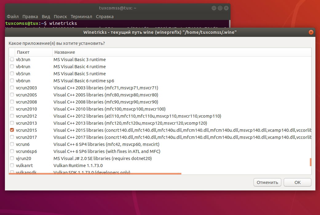 Наполнение Wine с помощью скрипта Winetricks по одноименной команде: winetricks